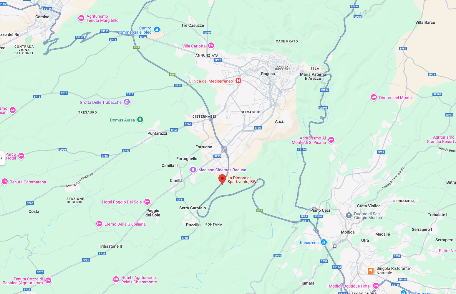 The hotel is located directly on the SS115, one of the most important connecting roads in the region. In just a few minutes, you can reach the old town of Ragusa, which is a UNESCO World Heritage site due to its baroque architecture. The nearby towns of Modica, Scicli, or Marina di Ragusa are also easily accessible and offer ideal excursion opportunities. Whether it's a walk through narrow alleys, an afternoon at the beach, or a visit to a local market – from here, you can experience Sicily in all its facets.