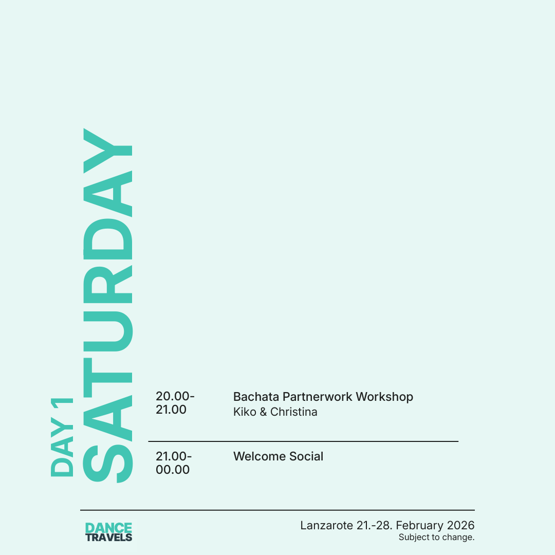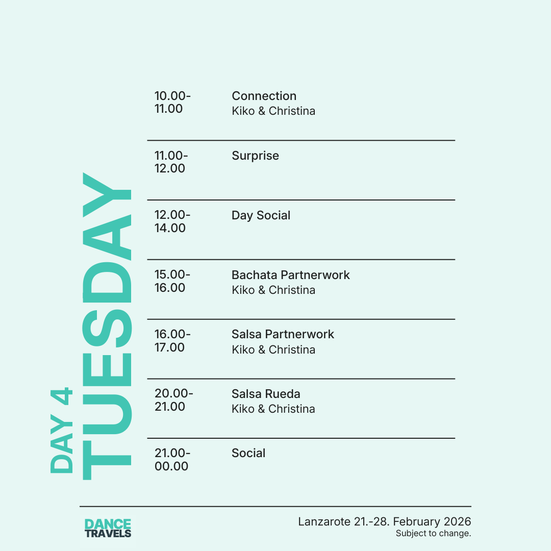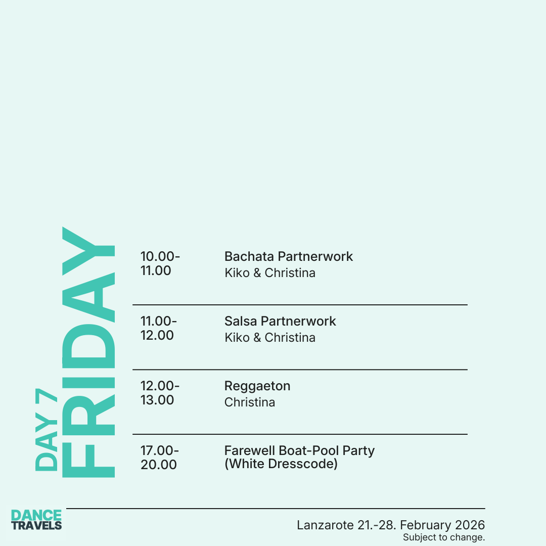 Erlebe vom 21. bis 28. Februar 2026 eine unvergessliche Tanzreise nach Lanzarote mit den international renommierten Tanzprofis Kiko & Christina! Freu Dich auf eine Woche voller intensiver Bachata- und Salsa-Workshops, täglicher Tanzpartys, entspannter Socials und besonderer Highlights wie unserer exklusiven White-Party am Pool Boot. Geniesse Deinen Aufenthalt im luxuriösen 5-Sterne-Hotel H10 Rubicón Palace und entdecke die einzigartige Schönheit der Vulkaninsel Lanzarote. Diese Tanzreise verbindet Tanzen, Reisen und Erholung perfekt – ein absolutes Highlight im Tanzjahr 2026!