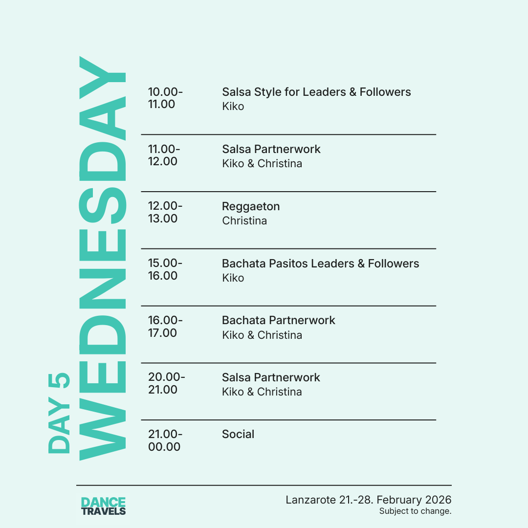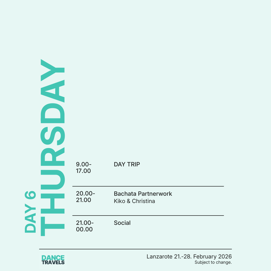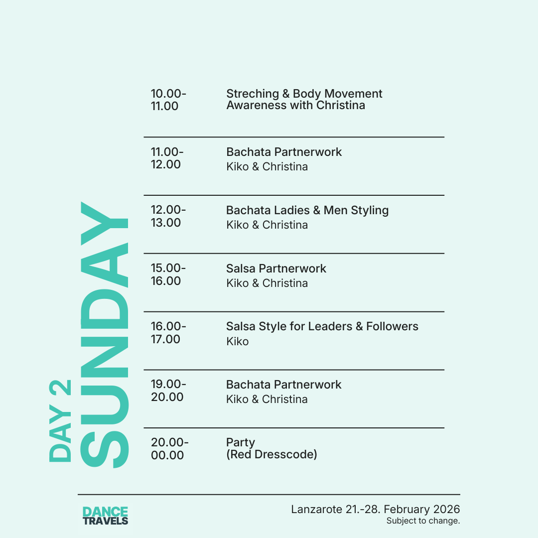 Erlebe vom 21. bis 28. Februar 2026 eine unvergessliche Tanzreise nach Lanzarote mit den international renommierten Tanzprofis Kiko & Christina! Freu Dich auf eine Woche voller intensiver Bachata- und Salsa-Workshops, täglicher Tanzpartys, entspannter Socials und besonderer Highlights wie unserer exklusiven White-Party am Pool Boot. Geniesse Deinen Aufenthalt im luxuriösen 5-Sterne-Hotel H10 Rubicón Palace und entdecke die einzigartige Schönheit der Vulkaninsel Lanzarote. Diese Tanzreise verbindet Tanzen, Reisen und Erholung perfekt – ein absolutes Highlight im Tanzjahr 2026!