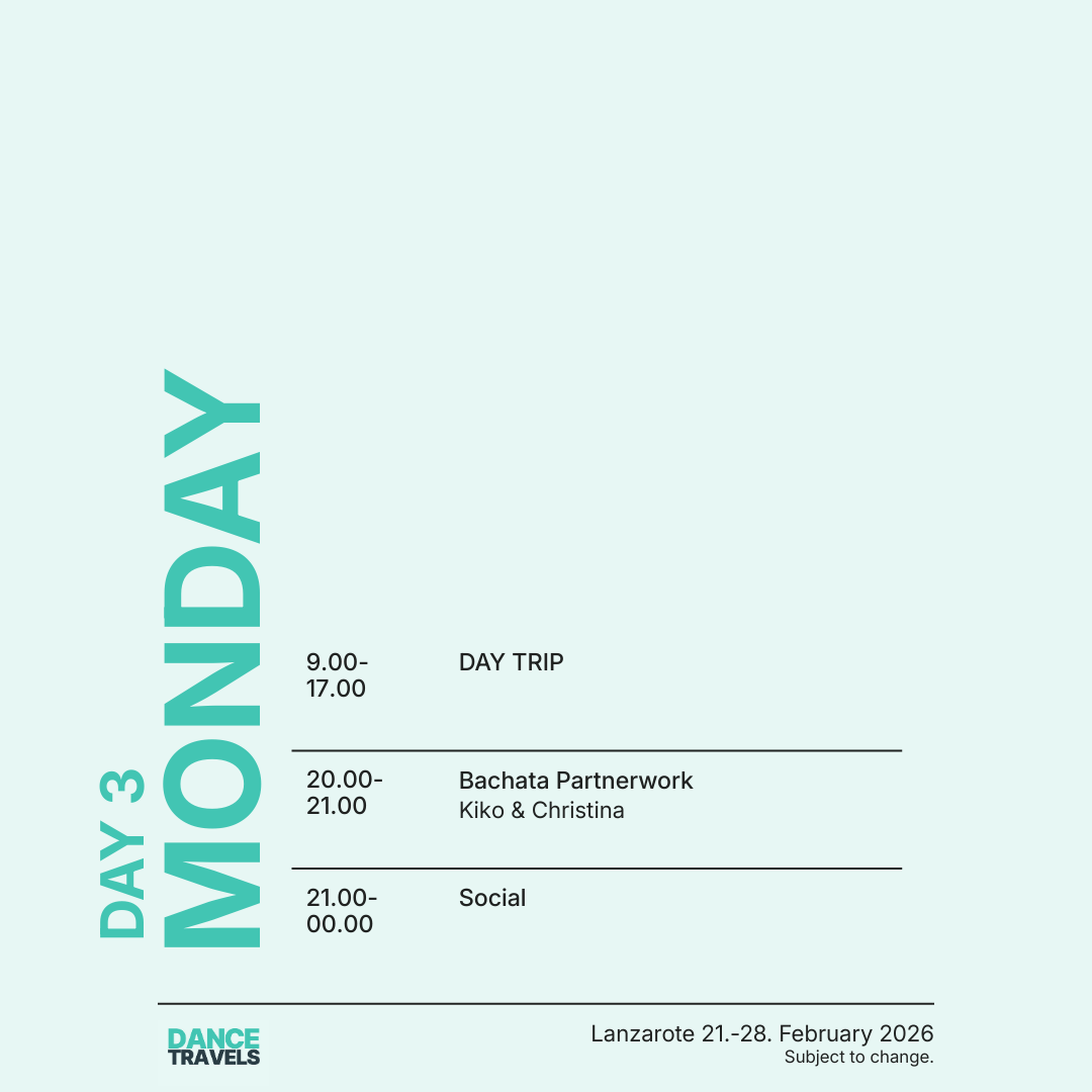 Entdecke die Highlights unserer exklusiven Tanzreise auf Lanzarote. Freue dich auf erstklassige Workshops mit Profis, traumhafte Tanzpartys, spannende Ausflüge und ein luxuriöses Hotel direkt am Meer. Lerne neue Freunde kennen und geniesse unvergessliche Tage mit Tanz, Sonne und Entspannung.